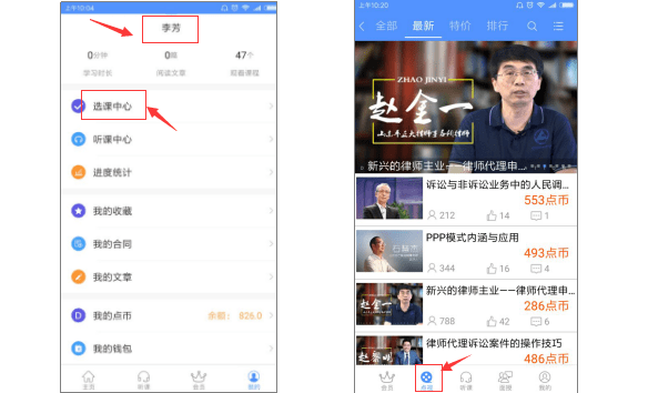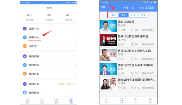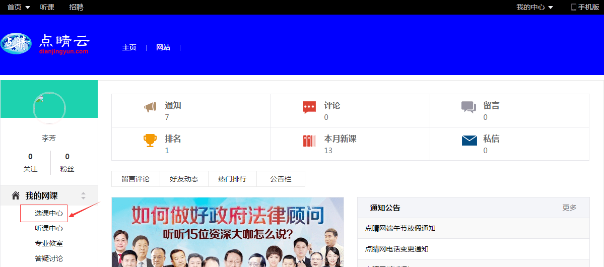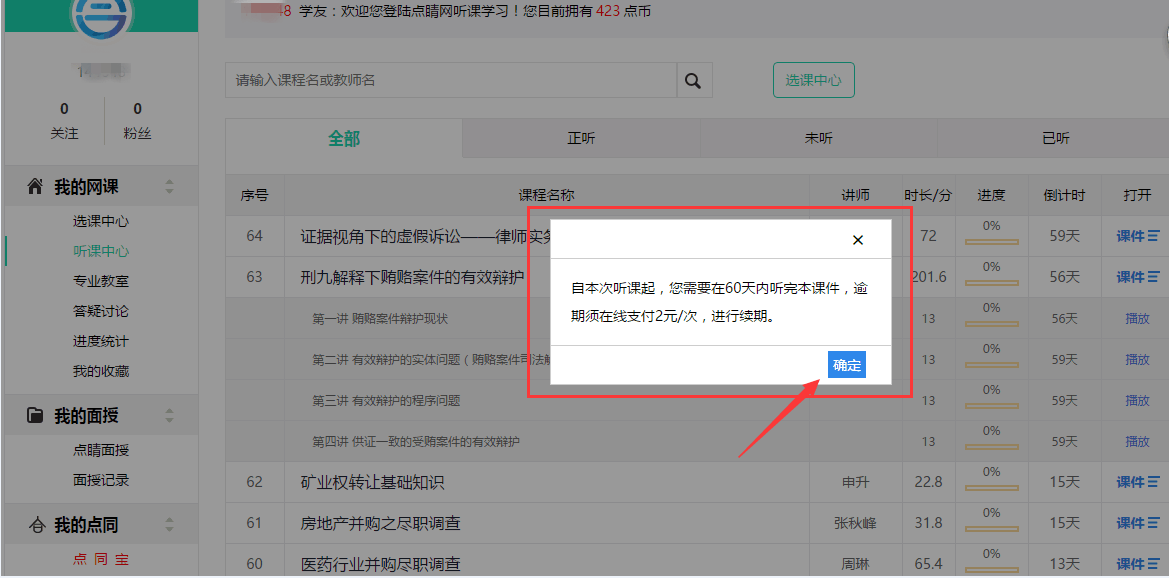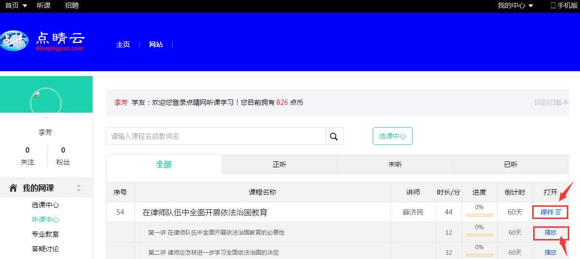 2. 进入正确的学院后,点击左上角“听课” ,系统直接跳转到学员的个人后台页面。有学员的个人后台页面。有学员的账号、姓名、点币数信息显示以及学员的听课情况。如下图: