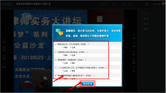 4.学员的课程在该门课程听课时间大概20分钟后,系统会提示需要考试合格方可继续学习,如下图: