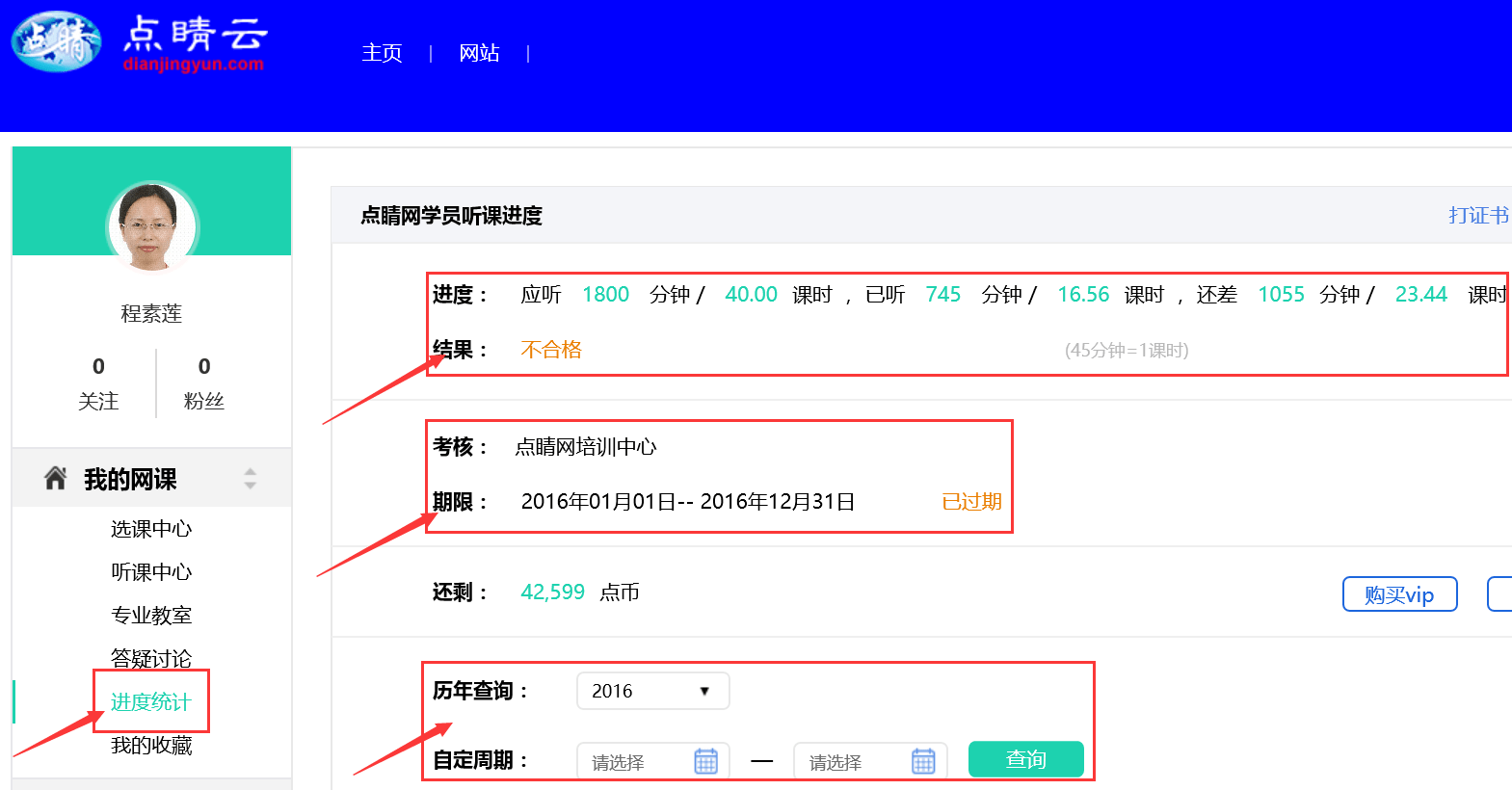 四、学员如何查看课时 1.律师如何查看课时 1.1 学员登录进入到个人后台页面,点击网页左侧“进度统计”,页面显示您是否合格,可实时查看学习进度。如下图: ![]() 1.2 如果您完成了所要求课时会显示“合格”,需要听课证明,请点击“打证书”。如下图: