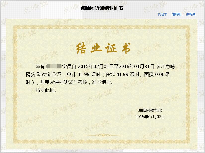 四、学员如何查看课时 1.用户如何查看课时 1.1 用户登录相应的学院后,点击“我的”,再点击“进度统计”,学员听课统计结果如下图: ![]() 1.2 如果您完成单位要求课时系统显示“及格”,需要听课证明,请登录电脑个人账号,在进度统计中打印证书。证书样式如下图: