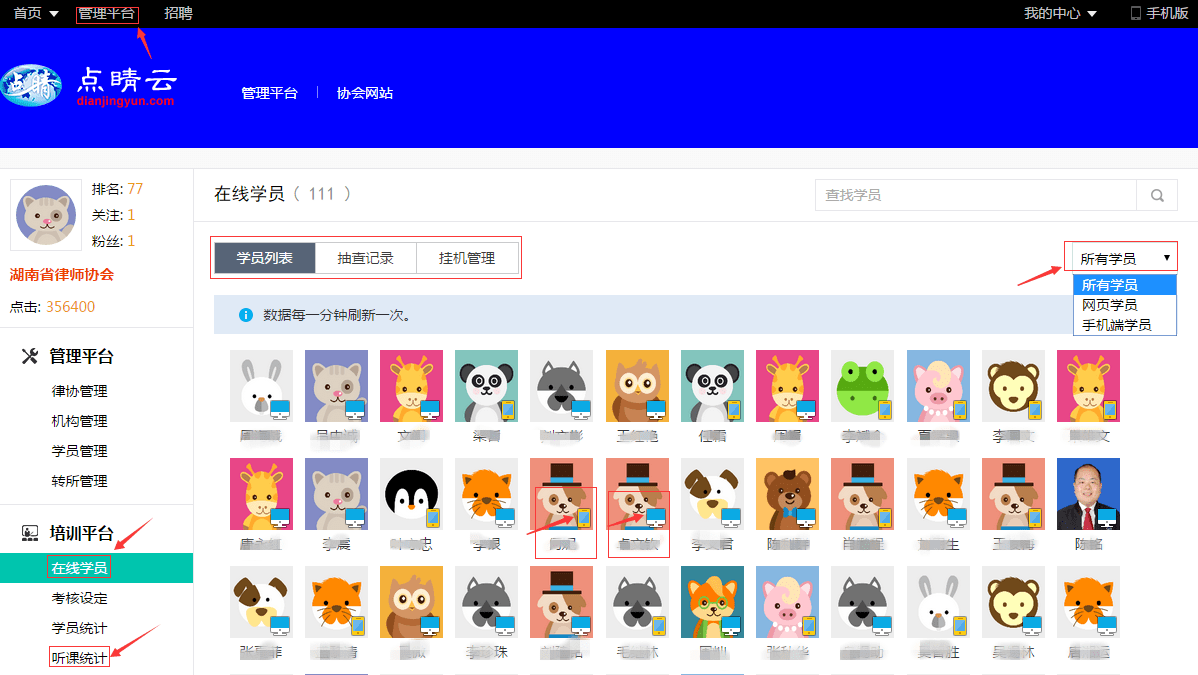 3.防挂机管理 管理员选择“任一在线学员”,发送询问信息,对方未及时回复,可分别给予“警告”,“黄牌”,“红牌”,当红牌发送则当前节课程学习进度清零。