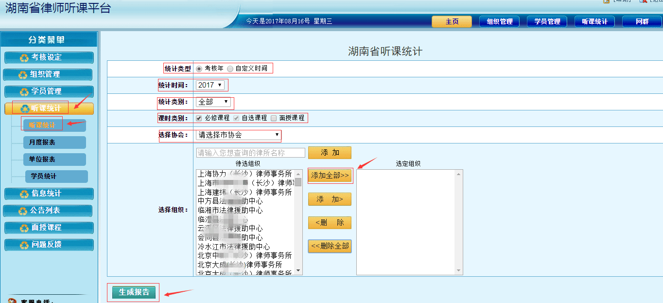 2.2 管理员如果想导出学员听课明细,请点击左侧“听课统计”,点击“添加全部”,再点击“生成报告”,如下图: