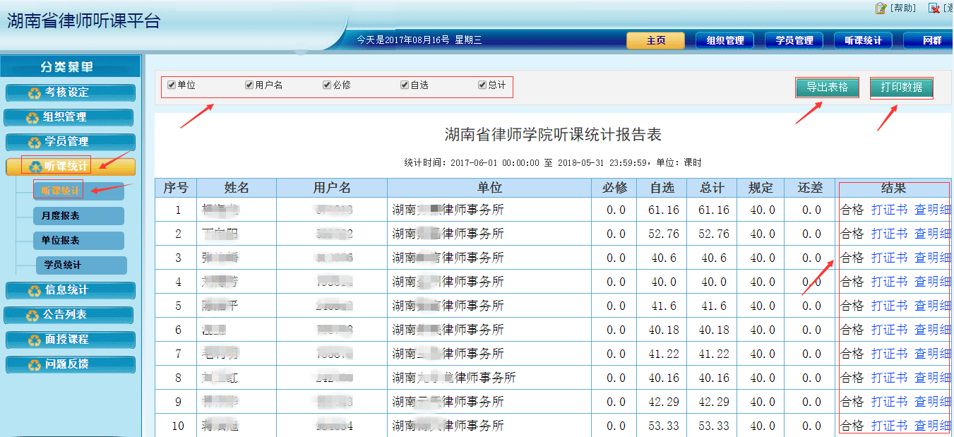 2.3 管理员如果想导出或打印出数据,选择“导出表格”或“打印数据”,掌握听课进度。