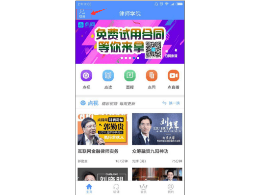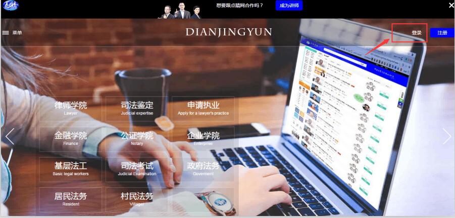 二、学员如何选择新课 1.学员登录后,右上角会显示您的听课账号。点睛网设有十五个学院,目前“律师学院”、“申请执业”、“司法鉴定”、“公证学院”、 “基层法工”等学院已开通使用。登录成功后选择相应自己身份的学院进入。如下图: