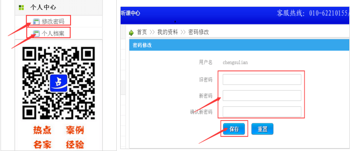 五、学员如何修改信息 1. 点击左上角“听课”,在左下角点击“修改密码”输入旧密码,点击“保存”如下图: