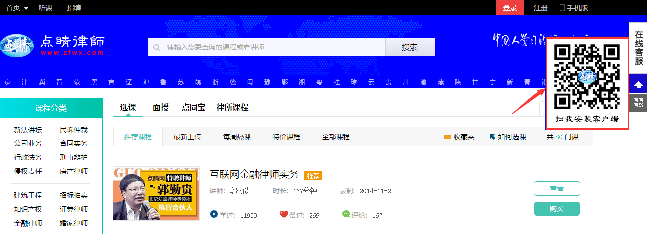 5. 确定购买后,您可以继续选课,也可以去听课。也可以扫二维码安装APP用手机和平板听课。如下图: