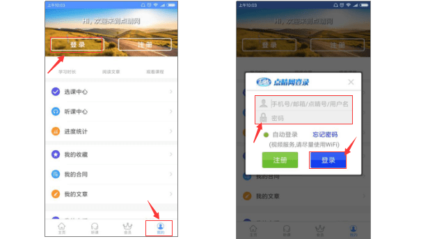 2.点击右下角“我的”再点击下方,“邮箱或手机”,验证邮箱或手机,手机号或邮箱绑定成功可作为听课账号登录点睛网。