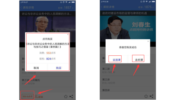 2. 点击左下角“***点币” 点击“购买” 。 购买成功您可以继续选课也可以去听课。如下图: